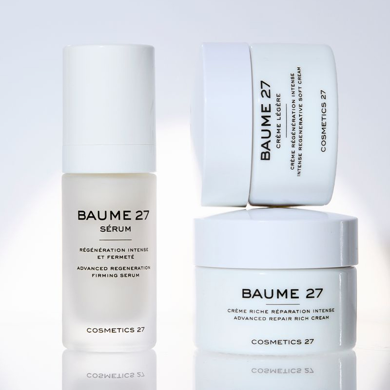 Первый и самый популярный продукт бренда – Baume 27, интенсивный регенерирующий крем, который запускает процессы обновления, укрепляет кожный барьер и заметно улучшает текстуру кожи. Его можно использовать при повреждениях и сильном раздражении кожи на лице и теле, например, при ожогах или в период восстановления после агрессивных косметологических процедур.